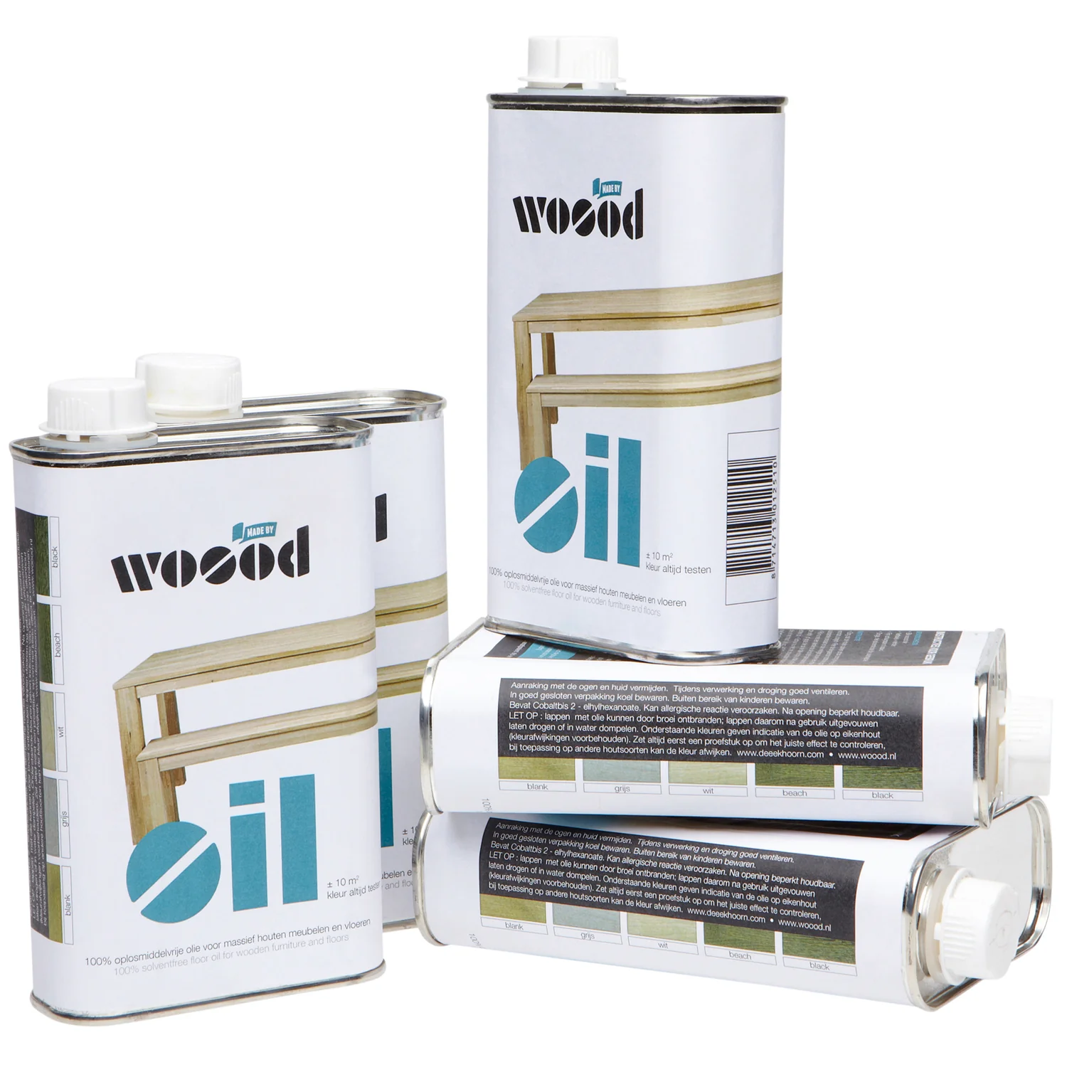 WOOOD olie ten behoeve van het behandelen van massief eiken meubelen. Massief eiken is sterk en duurzaam, geschikt voor intensief gebruik. De eiken artikelen worden onbehandeld geleverd. Om het natuurlijke karakter van het hout te behouden adviseren wij om het hout te behandelen met olie van WOOOD. Deze olie, speciaal ontwikkeld voor massief eiken meubelen en vloeren, is goed bestendig tegen vuil en vlekken. De olie is verkrijgbaar in 6 kleuren. Bij de transparante olie blijft de originele kleur van het hout behouden. De blanke olie geeft het hout een warme kleur, de witte olie geeft het hout een vaal, ietwat gebleekt karakter en de grijze olie geeft het hout een vaal grijs karakter. Met één blik olie kunt je ca 10m2 behandelen. De kleur op internet kan mogelijk iets afwijken van de echte kleur, wij adviseren daarom voordat je start met het oliën van het meubel eerst een proef-stukje op de onderzijde van het meubel te proberen.
